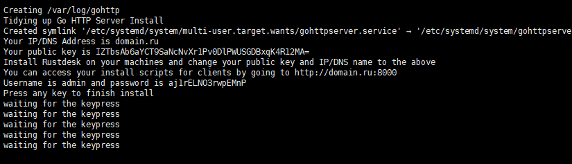 Скрипт завершит установку и выведет ключевую информацию для работы RustDesk сервера.
