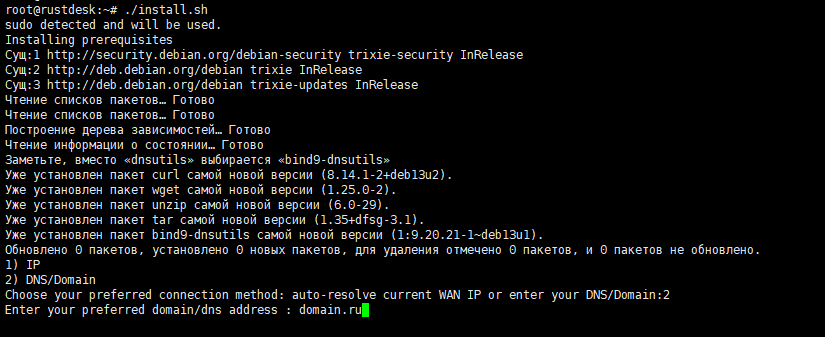 Скрипт завершит установку и выведет ключевую информацию для работы RustDesk сервера.